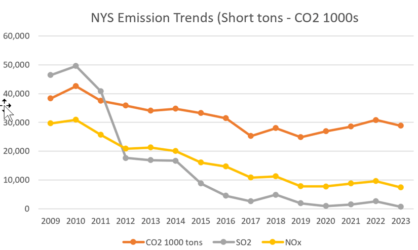 The following table lists the emissions since 2009 when the Regional Greenhouse Gas Initiative started. Emissions of CO2, SO2, and NOx are down dramatically over this period. The primary reason is that the fracking revolution made the cost of natural gas so cheap relative to other fuels that every facility that could convert to natural gas did so. New York banned the use of coal in 2021 which forced the retirement of the remaining coal plants. The state still has some facilities that primarily burn residual oil but those run infrequently. The takeaway message is that the fuel switching options are no longer available so future reductions will only come as zero-emissions resources displace facilities burning fossil fuels.