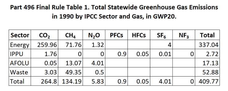 (a) For the purposes of this Part, the estimated level of statewide greenhouse gas emissions in 1990 is 409.78 million metric tons of carbon dioxide equivalent, using a GWP20 as provided in Section 496.5 of this Part.