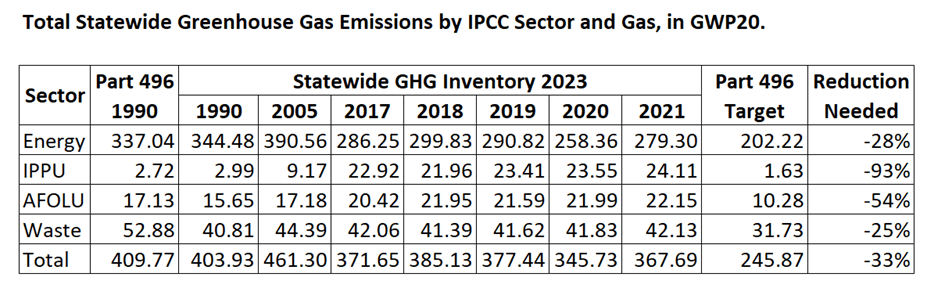 I extracted summary data from each of the sectoral reports to provide some idea of where New York stands relative to the 2030 targets in the following table. The Part 496 1990 column lists the regulatory baseline numbers. The estimated emissions in the 2023 Statewide GHG Emissions are listed for 1990, 2005, and the last five years. I list the sector 2030 targets (40% of 1990 emissions) and the percentage reduction necessary to meet the targets.