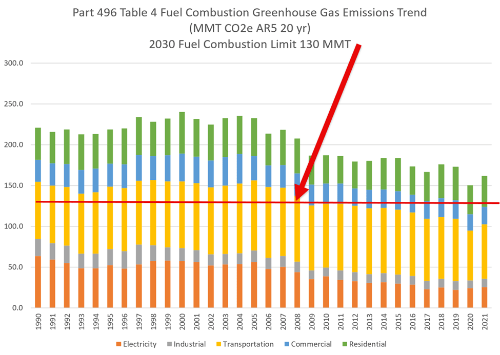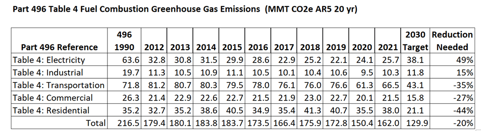 The Regulatory Impact Statement for Part 496 included Table 4 that broke down fuel combustion GHG emissions within the IPCC energy sector. Because I used the dataset itself, I picked the sector categories that I believe match the Table 4 categories. Note that I did not include fuel combustion from petroleum refining in the table because I could not find categories that I thought matched it. The following table lists the results for the last ten years and compared the 2021 emissions to the 2030 target. Fuel combustion in the electric and industrial sectors are already lower than the equivalent 2030 targets. On the other hand, transportation and fuel combustion in the commercial and residential sectors will require significant reductions to meet the targets.