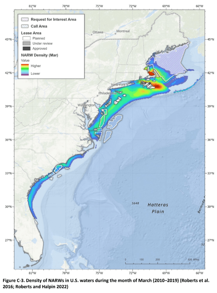 I cannot imagine any scenario where a species this stressed will survive when hundreds of massive wind turbines are built across the migration routes. See the figure showing where the turbines will be built and the whales are for March.