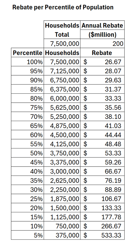 In this section I will put some context around these numbers: rebate totals $200 million and gives a one-time credit to 8 million directly metered electric and gas customers which “amounts to roughly a one-time bill credit of about $24.”  In my opinion it is disappointing that this rebate apparently is being given to everyone and not limited to those who can least afford high energy costs.  I calculated the rebate as function of the number of household percentiles.  Using 7.5 million households as the state total and dividing by the $200 million rebate gives $26.67 per household.  If only half the households are eligible for the rebate the $200 million is divided by 3,375,000 the rebate goes up to $53.33.  The numbers quoted earlier are different simply because a different number of households was used.