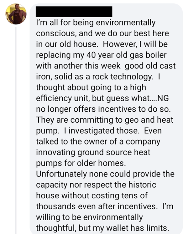 The Iron Law can be described as wallets have limits. Beyond the simple cost impacts there is another concern. The National Grid Upstate New York Residential Gas Heating program is paused and not accepting rebate applications. National Grid is forgoing efficiencies now to encourage adoption of cold-climate heat pumps. This is disservice to National Grid ratepayers because it does not acknowledge thatthe State’s Scoping Plan to implement the Climate Act notes that not all homes will be able to electrify home heating safely and affordably. Exactly the case in this example. It is not only that there is a cost factor but there is a safety factor for electrification. Removing incentives for homeowners that have no other choices is short-sighted.