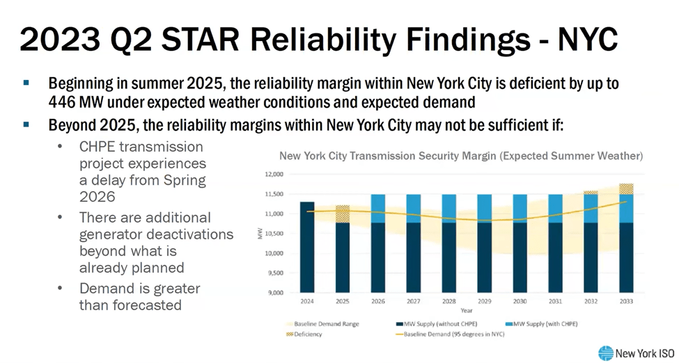 The quarterly Short-Term Assessment of Reliability (STAR) reports should be required reading for anyone interested in the New York electric system so Lin’s explanation is important. The following slide notes that last years second quarter report noted that there was a reliability deficit of 446 MW in the summer of 2025. The deficit was projected because of fossil unit deactivations. In response, NYISO opened a solicitation for market solutions or regulatory solutions. No feasible market solution was submitted.