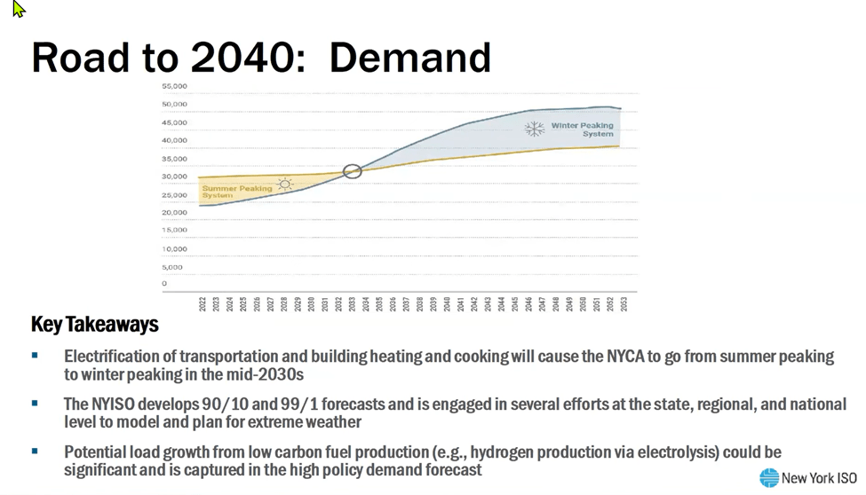 The next four slides summarize the challenges to meet the 2040 Climate Act mandate for a “zero-emissions” electric grid. The next slide repeats the points raised in the previous slide. Lin remarked that the year of the cross over from summer to winter peaking can only be guessed at this time. Depending on the trends in load it could be almost anytime in the next decade. The 90/10 and 99/1 forecasts are probability estimates for the likelihood of extreme weather events. The final bullet in the slide points out that there could be substantial load growth needed to provide reliability services. The NYISO includes a high load policy case that incorporates this load.