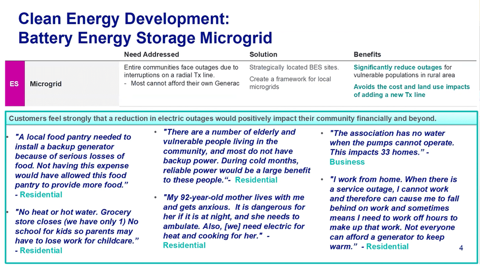The next slide gives an example of their proposed reliability solutions. He included the obligatory argument that we are seeing more “frequent storms” that ignores the differences between weather and climate. He went on to give examples where a reduction in outages would positively impact their community. The proposed solution is a microgrid with battery energy storage. In my opinion, however, this is another example of a clean energy solution that works well most of the time but will fail when needed most. The problem here is the specification for battery storage. In the future New York system when home heating and transportation are both electrified the worst case will be an extended outage due to an extreme weather event like an ice storm. Specifying the battery storage for an ice storm event that occurs every 20 years will probably be too costly but when the inevitable ice storm does occur everyone in the microgrid will be at extreme risk because the energy storage system will run out of power. Fossil fuels are energy dense and can be stored making them much better for emergency backup.