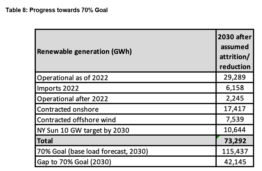 The Climate Leadership and Community Protection Act (CLCPA) of 2019 requires that the Public Service Commission (PSC) issue a review for notice and comment that considers “(a) progress in meeting the overall targets for deployment of renewable energy systems and zero emission sources, including factors that will or are likely to frustrate progress toward the targets; (b) distribution of systems by size and load zone; and (c) annual funding commitments and expenditures.” This Report serves to inform the Commission’s review. It summarizes the progress made toward the renewable energy and zero emission goals set by the CLCPA since the establishment of New York State’s Clean Energy Standard (CES), assesses what remains to be done to achieve those goals, presents policy options and proposals, and invites comments from stakeholders and the public on these or any other matters raised in this Report. The Report focuses in particular on New York’s goal to obtain 70% of New York’s electricity from renewable sources by 2030 (the 70% goal) and the related goal of 9 gigawatts (GW) of offshore wind by 2035.