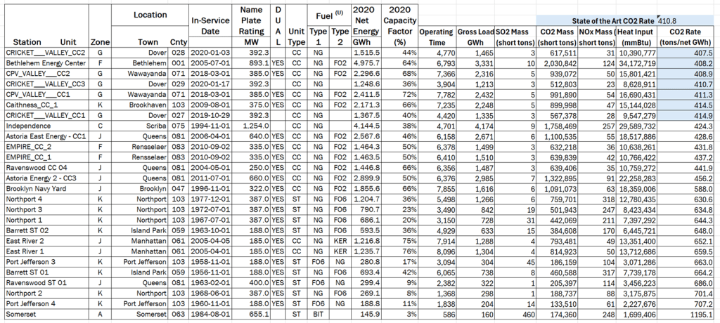I manually combined 2020 data from the two data sets for 43 electric generating units as shown in Table 3 from the report (NY Emissions Analysis.xls “Compare 2020” tab). It combines the NYISO net energy (GWh) and the EPA CO2 emissions (tons) to determine the state-of-the-art CO2 emission rate (tons/GWh). Note that the CO2 emission rate ranges from just over 400 for the combined cycle gas turbines to 1200 tons per GWh for a coal plant. I assumed that the new Cricket Valley, CPV-Valley, and Caithness combined cycle gas turbines represent a state-of-the art combined cycle power plant. Table 3 shows that those three facilities do represent the lowest emission rates and that the Bethlehem Energy Center is within their ranges so also state-of-the-art. I assumed that the average of the blue highlighted cells represents a representative state-of-the-art combined cycle power plant CO2 emission rate (410.8 tons CO2 per GWh).