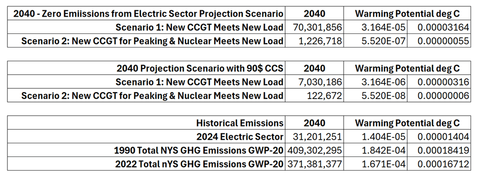 My results showed that significant reductions are possible with these scenarios. If nuclear and hydro stay the same and new CCGT is used to make up the capacity and energy necessary to match the NYISO forecast, then the emission projection is 70,301,856 tons of CO2 or 7,030,186 tons with 90% CCS controls. This is an overestimate because the NYISO projection incorporates over-building wind and solar capacity that would not be necessary if conventional generating resources are used. The second scenario in which nuclear is used for everything except peaking generation and CCGT is only used for peaking purposes is probably closer to a realistic estimate. That scenario predicts that using fossil fuels solely for that purpose would produce 1,226,718 tons of CO2 and only 122,672 tons if 90% CCS was employed. This also is an over-estimate because of the renewable over-building but the significantly lower emissions shows how effective nuclear power is for reducing emissions.