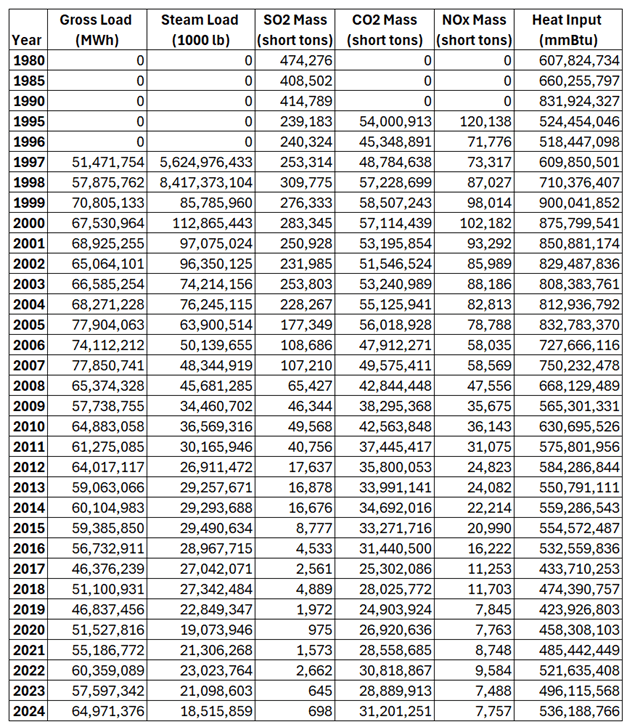 The detailed analysis that I submitted to the Committee included this section on context. I joined Niagara Mohawk Power Corporation (NMPC) in 1981 and one of my responsibilities until I retired in 2010 was accounting and reporting air pollution emissions. I think it is important to understand that there have been massive reductions in electric generating unit emissions in New York since the time I joined the utility industry. The earliest records I have date back to 1984. At the time NMPC owned and operated oil-fired facilities in Albany and Oswego and coal-fired plants in Dunkirk and Tonawanda. In 1984 those facilities emitted 136,684 tons of sulfur dioxide (SO2), 37,221 tons of nitrogen oxides (NOx), and 12,530,220 tons of carbon dioxide. In 1995, according to the Environmental Protection Agency all the fossil fueled power plants in New York emitted 239,183 tons of sulfur dioxide, 120,138 tons of nitrogen oxides, and 54,000,913 tons of carbon dioxide. In 2024 all the fossil fueled power plants in New York emitted 698 tons of sulfur dioxide, 7,757 tons of nitrogen oxides, and 31,201,251 tons of carbon dioxide. The following table (NY Emissions Analysis.xls “NYS” tab) lists the annual values from 1980 until 2024.
