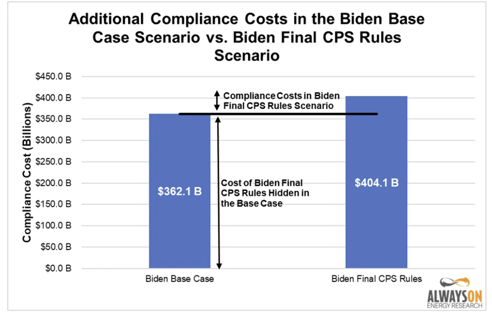 The Biden administration claimed that its final power plant wrule ould only increase costs by $19 billion over a 24-year period, spanning from 2024 through 2047, using a 2 percent discount rate. However, this modest compliance cost is entirely due to the fact that most of the expenses for the modeled MISO grid in the Biden Final CPS Rules IPM output files are incurred in the Biden Base Case.