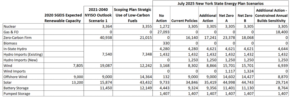As I documented in the August 12, 2025 PSC filing, the problem is that the original expectations of renewable capacity for the Climate Act falls far short of the renewable capacity requirements in more recent assessments. The following table compares the capacity (MW) in the 2021-2040 NYISO Outlook Scenario 1, the Scoping Plan Strategic Use of Low-Carbon Fuels Scenario and six scenarios in the July 2025 Draft State Energy Plan. There are inconsistencies in the categories but the massive increase in renewable resources is obvious. Onshore wind is projected capacity is 145% higher than analyzed, offshore wind expected capacity is 62% higher than analyzed, and solar is 241% higher than the maximum scenario expectation. In addition, no previous analysis considered the environmental impacts of massive energy storage facilities or the “zero-carbon firm resource” that the integrated analysis presumes will be provided by hydrogen resources. The Draft Energy Plan needs to address this failing.