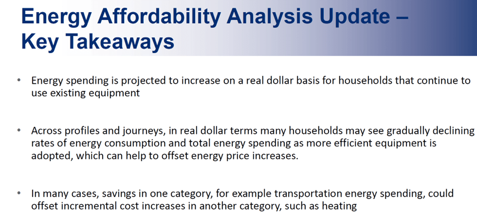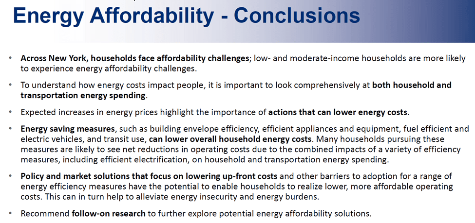 The affordability messaging has been consistent. NYSERDA acknowledges that there are energy affordability challenges. The Climate Act embeds environmental justice principles throughout its implementation framework, so descriptions include low- and moderate- income household impacts that are consistent with this narrative talking point, Unsurprisingly, those households are “more likely to experience energy affordability challenges”.