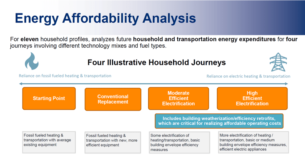 The following energy affordability analysis slide explains that for eleven household profiles, NYSERDA evaluated future household and transportation energy expenditures for four cases involving different technology mixes and fuel types. These “Illustrative Household Journeys” include: