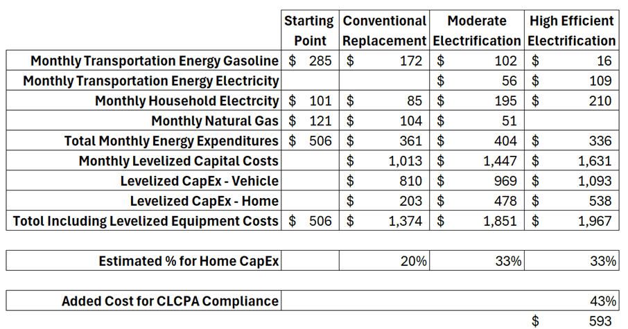 The Hochul/NYSERDA story is that monthly energy expenditures will go down when investments in moderate electrification or high efficiency electrification necessary for Climate Act compliance are made. The public release sound bite press releases will emphasize that point and barely acknowledge that the costs that include the capital expenses (CapEx) for the equipment costs tell a different story. I summarized all this information in Table 1. The first four rows list the monthly energy expenditures with the total in the fifth line. The CapEx monthly total cost is listed but the breakdown between the costs of a new plugin hybrid electric vehicle (moderate electrification) and a battery electric vehicle (high efficiency electrification) relative to home energy electrification is not provided. I estimated the percentage of home electrification from the bars in the previous figure. When those CapEx costs are included all the projected alternative journeys are more expensive. Note that the difference between replacement of conventional equipment and the highly efficient electrification equipment necessary for Climate Act compliance increases monthly average energy expenditures $593, a whopping 43% increase in energy costs. That is the cost of Climate Act compliance.