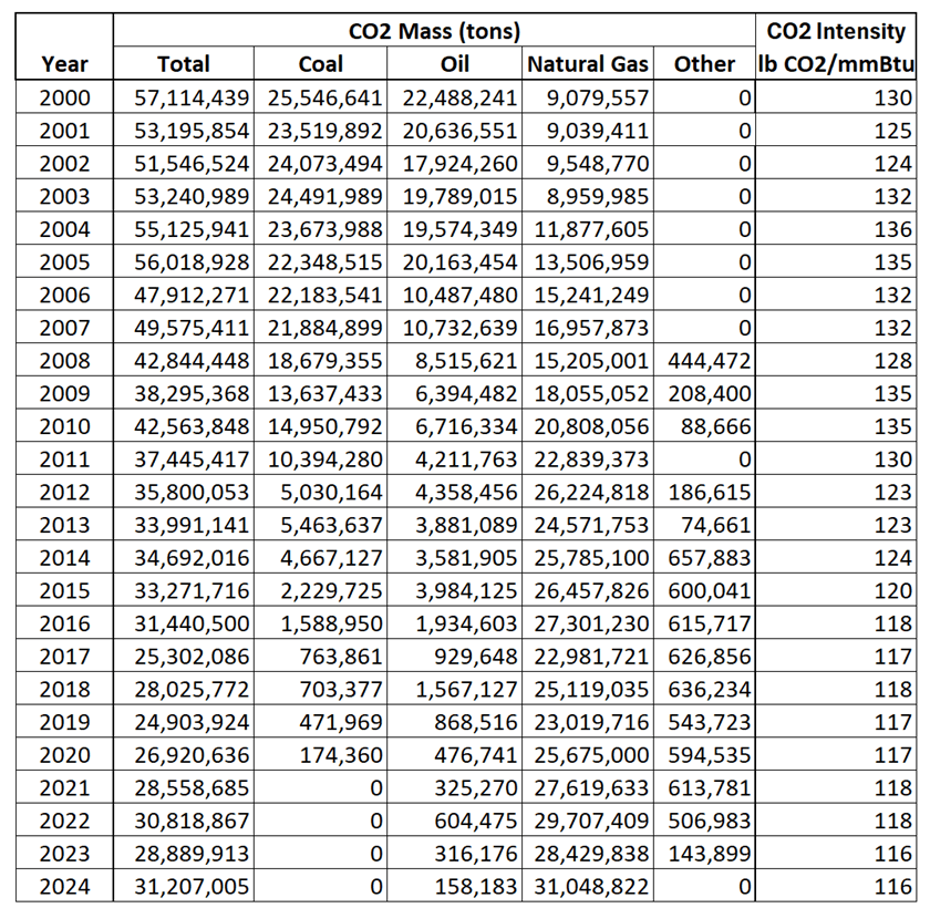 Table 2 lists the annual emissions since 2000 through 2024. Claims that the program has “successfully lowered CO2 emissions intensity and absolute emissions” are debunked in the following table and figure. This table lists mass CO2 emissions by fuel type along with the emission rate or intensity. Both absolute and emissions intensity do go down.