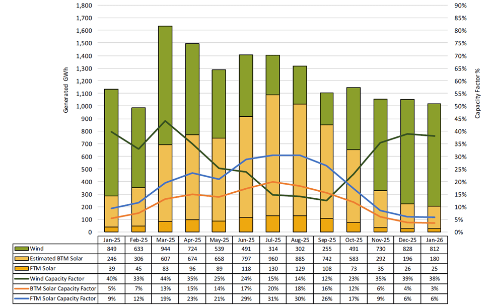 Figure 1: Net Wind and Solar Performance Total Monthly Production and Capacity Factors