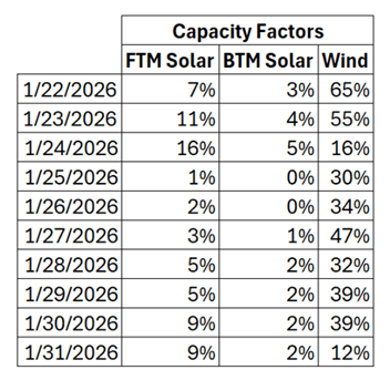 This effect was seen during the January 24 to January 27, 2026 winter storm. Following the storm there was a period of prolonged sub-freezing weather that caused a peak in the electric load. Table 1 lists daily extrapolated statewide capacity factors from Figure 2. Consider January 31 when the statewide capacity factors were BTM solar 2%, FTM solar 9%, and wind 12%. The total daily renewable energy capacity factor was 10% and only provided 2% of the system’s daily load. Data from individual facilities are not available but the hourly statewide data indicate that wind capacity was less than 10% for 13 hours including the morning and evening peak loads.