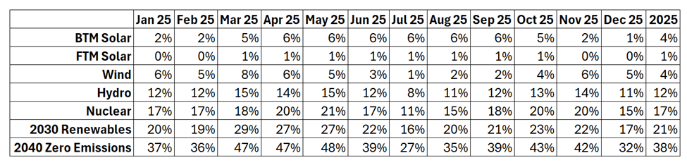Table 2 compares the observed emissions free data to the 2030 and 2040 targets. In 2025 the sum of solar, wind and hydro contribution to gross load was only 21%, far short of 70%. Adding nuclear to the total, zero emissions are only 38% of the total gross load. Trying to achieve 100% in 15 years is not likely in my opinion.