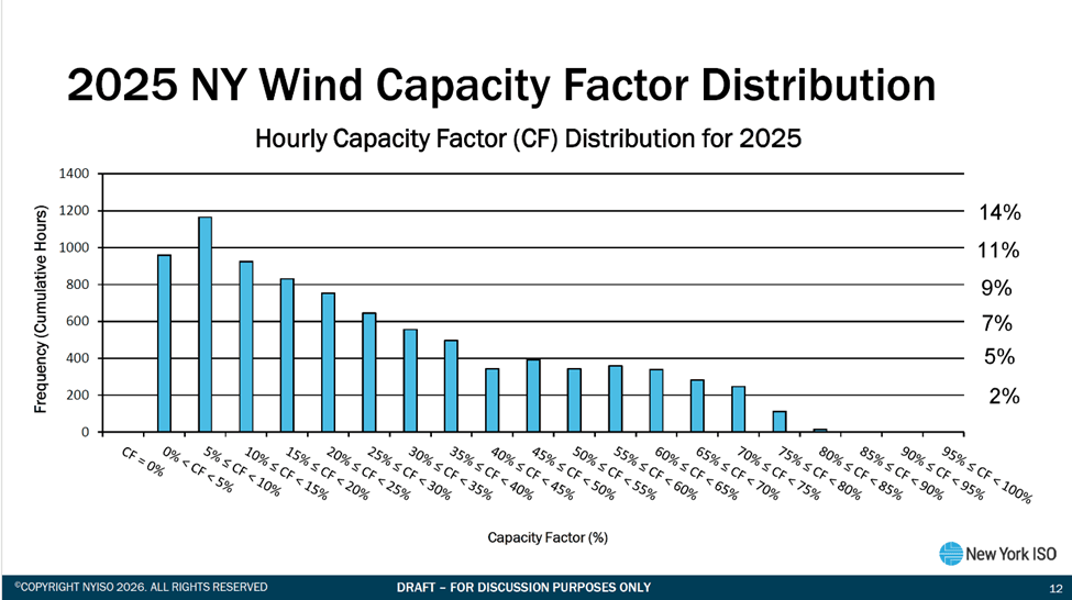 Figure 4 lists the frequency of hourly capacity factors in 2025. There were less than 1,000 hours when the capacity factor of all the wind generators in the state were between 0% and 5%. I added the annual percentages on the right for the hourly frequency labels on the left. The less than 1,000 hours when the capacity factor of all the wind generators in the state were between 0% and 5% is somewhere between 9% and 11% of the annual hours. I included this to show that the wind capacity factor across New York State was less than 10% for nearly a quarter of the hours. At the other end, there are less than 20% of the hours when the statewide capacity factor exceeds 50%. New York does not have an impressive wind resource capacity.