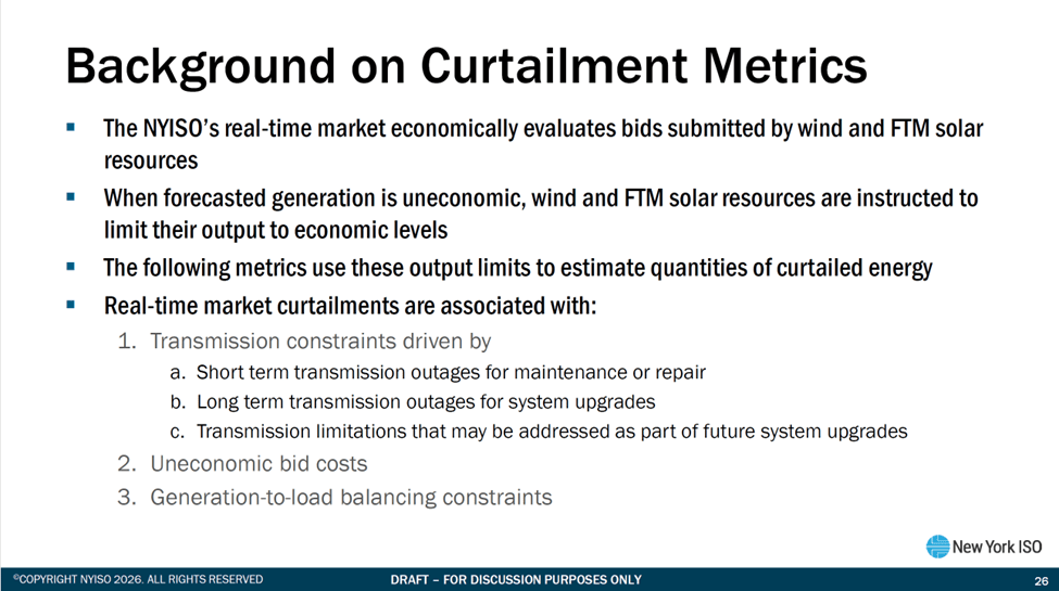 Figure 9 “Background on Curtailment Metrics” explains the criteria for curtailments. The NYISO’s real-time market economically evaluates bids submitted by wind and FTM solar resources and when forecasted generation is uneconomic, wind and FTM solar resources are instructed to limit their output to economic levels. This section finds that real-time market curtailments associated with transmission constraints are the primary current driver of curtailments. Those can be outages for maintenance, repair or upgrades or something that requires upgrades to the system. All those who claim that the Climate Act does not affect utility rates must ignore that the costs for these transmission improvements are buried in the rate cases. Someday the over build necessary to supply peak loads with as much renewable as possible will shift the reason for curtailments to generation-to-load balancing constraints.