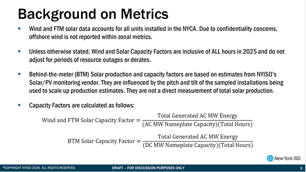 Slide 3 in the presentation (Figure 1) documents the metrics used. Offshore wind data is not reported because there is only one active facility and NYISO does not report individual unit information. Past presentations and datasets are also available, Annual Renewable Presentations and hourly data sets from prior years can be found at the this primary link ant the locations below.