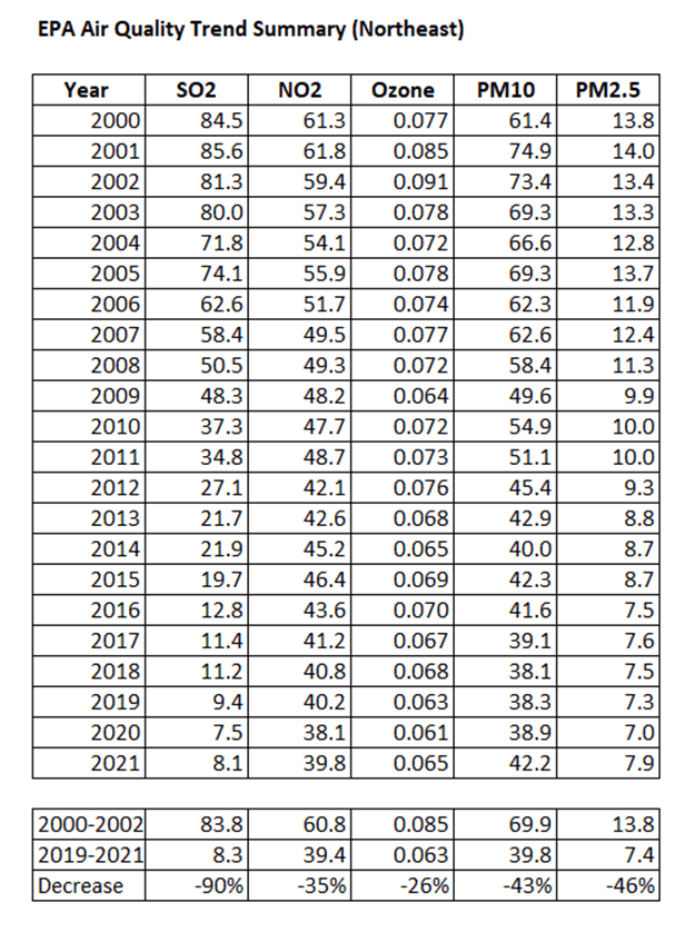 It is rarely noted by environmental activists that PM2.5 air quality has improved markedly since 1999 mostly because of national reductions in sulfur dioxide and nitrogen oxides emissions. The NYS DEC air quality monitoring system has operated a PM2.5 monitor at the Botanical Garden in New York City since 1999 so I compared the data from that site for the same period as this analysis relative to the most recent data available (Data from Figure 4. Baseline annual average PM2.5 levels in New York City). The Botanical Garden site had an annual average PM2.5 level of 13 µg/m3 for the same period as the report’s 13.9 µg/m3 “current conditions” city-wide average (my estimate based on their graph). The important thing to note is that the latest available average (2016-2018) for a comparable three-year average at the Botanical Garden is 8.1 µg/m3 which represents a 38% decrease. That is substantially lower than the PlaNYC goal of “cleanest air of any big city” scenario at an estimated city-wide average of 10.9 µg/m3.
