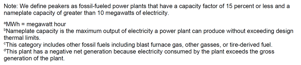 For the purpose of our report, we generally define peakers as plants that use fossil fuels, including natural gas, coal, and oil; have a capacity factor (the percent of energy produced over a certain time frame, out of what could have been produced at continuous full power operation) of 15 percent or less; and have a nameplate capacity (the designed full-load sustained output of a facility) of greater than 10 megawatts (MW) of electricity.
