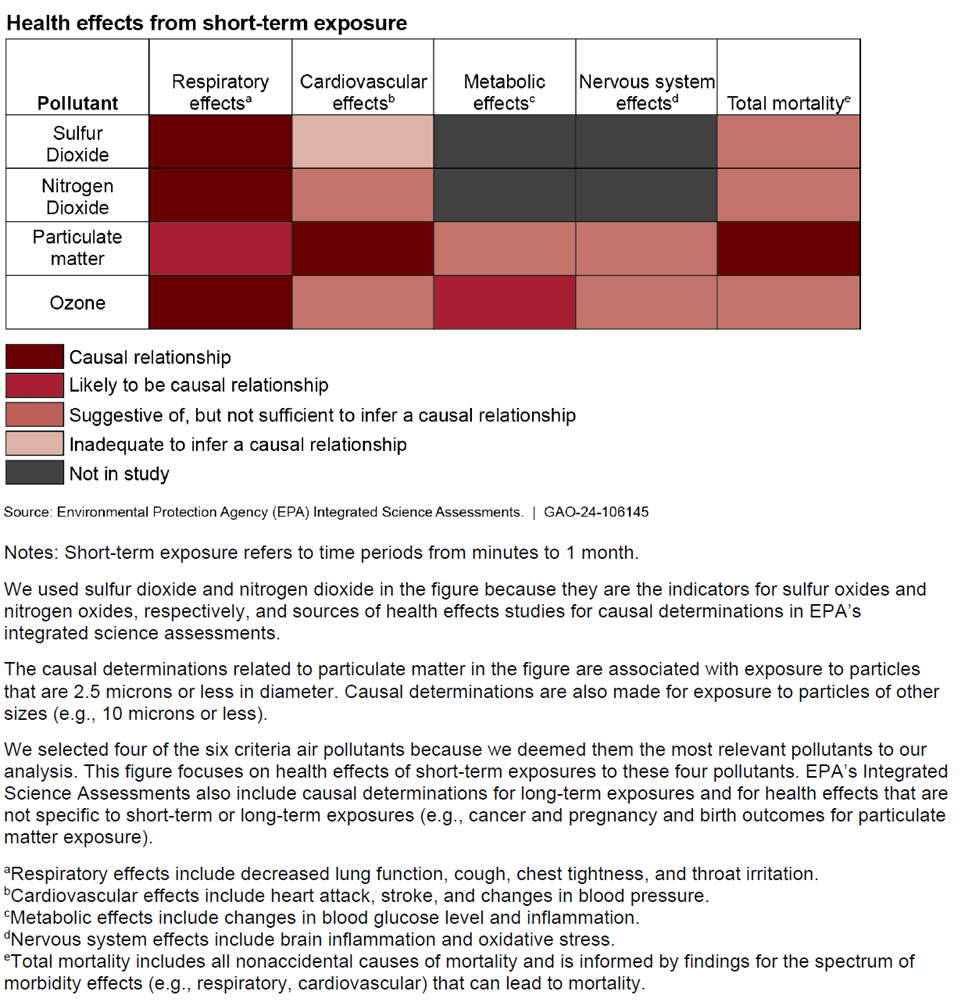 The presumption in the report is that any level of pollution is bad: “For instance, short-term exposure to sulfur dioxide—the indicator for sulfur oxides used in EPA’s assessments—can lead to negative respiratory effects, such as decreased lung function, cough, chest tightness, and throat irritation.” The GAO report summarizes health effects from short-term exposures. All this is nice but it ignores the NAAQS process to determine acceptable ambient air quality levels.