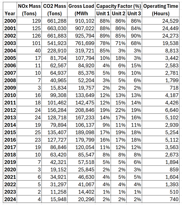 AEC claims that the facility has the potential to produce much higher greenhouse gas emissions and co-pollutants in the future. Table 1 lists the annual emissions and operating information for the last 25 years from the EPA Clean Air Markets Division website. That potential may exist but the historical data show that there has been vast operating and emission reductions since 2000. As a result, any alleged impacts from the facility should have improved significantly over time.
