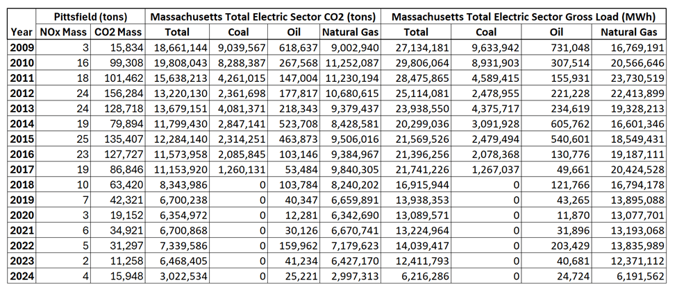 Table 2: Pittsfield Emissions Relative to Total Massachusetts Emissions and Operating Characteristics