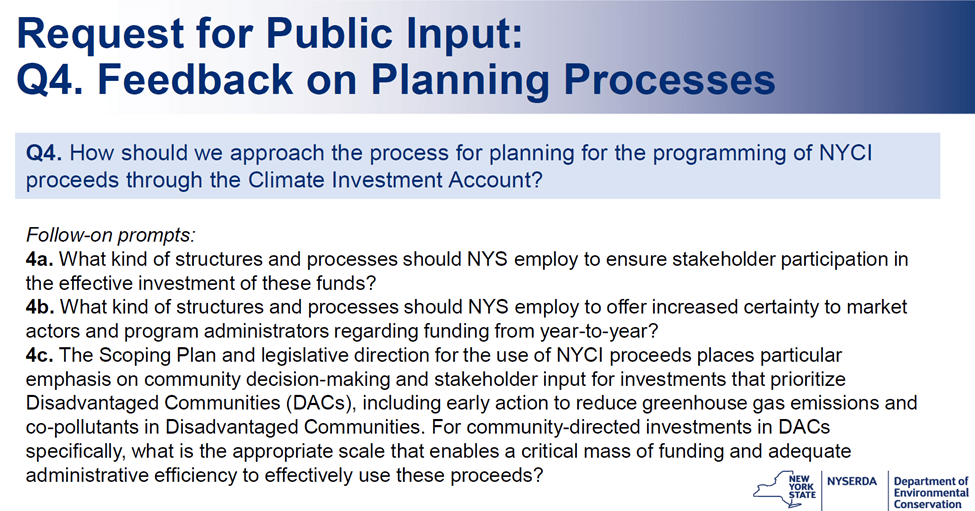 - Maximize benefits to disadvantaged communities: Low-income households spend a greater share of their income on energy, making them more vulnerable to the costs imposed by a cap-and-invest program. At the same time, disadvantaged communities are likely to feel more of the effects of emissions. NYCI should (and is required to) minimize the burden imposed on the communities that are most sensitive to increased costs of necessities, like home heating and transportation, and maximize economic and environmental benefits within those communities.