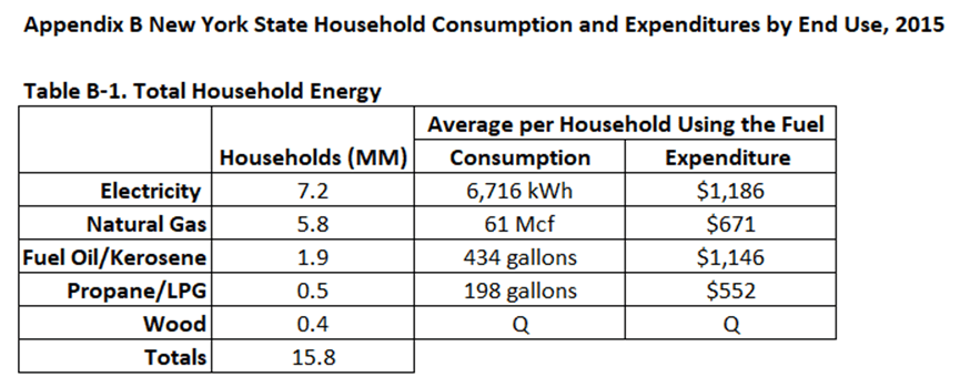 I evaluated this component of the plan and the emissions reductions that could be expected for comparison to the annual 5.32 million metric ton of CO2e reduction required to meet the binding cap. Instead of using the confusing and poorly documented Scoping Plan estimates of residential energy use I used the New York State Energy Research & Development Authority Patterns and Trends document. Appendix B, Table B-1 lists the average household consumption by fuel type. I calculated the GHG emissions (CO2, CH4, and N2O) for direct emissions and New York’s required upstream emissions for each fuel type to get an estimate of residential electrification impacts on emissions.