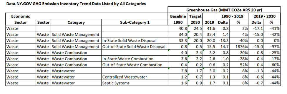 The Climate Act has exemptions for certain sectors. All components in the agriculture sector are not required to meet the 40% mandate and energy-intensive and trade exposed industries also get some sort of a pass. Even a cursory examination of the data in the graph suggests that the presumption that a binding cap will necessarily ensure compliance is magical thinking. The historical trend in electricity sector emission reductions appear similar to the trend necessary to meet the 2030 target but the historical trend was caused by fuel switching and there are no more reductions to be had in that regard. In order to reduce electricity sector emissions, the energy output will have to be displaced with wind and solar. Waste sector emissions have been more or less constant since 1990. An entirely new technology has to be implemented in the next seven years to get a 4.5% per year reduction in emissions.