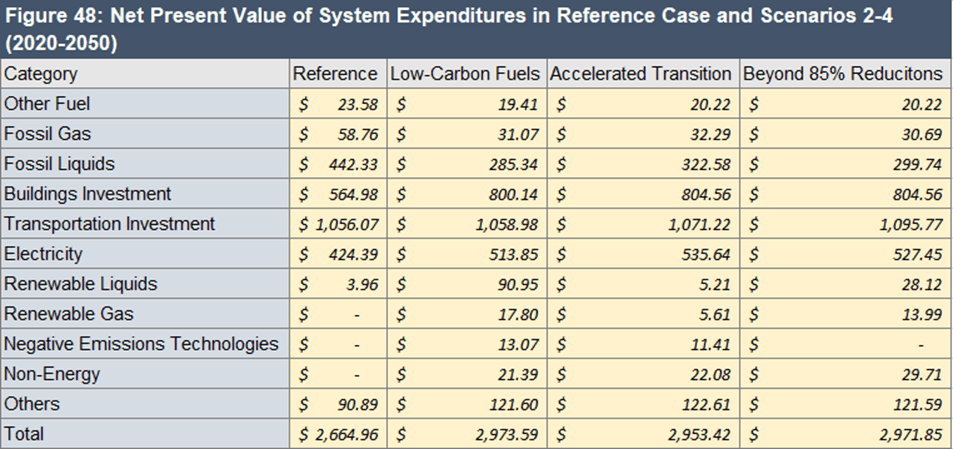 The next figure I evaluated in my analysis of the benefits claim was the total system expenditures shown in Figure 48. My biggest gripe was that the values in the Figure were not quantified. Thankfully the clarifying data in the updated spreadsheet provides numbers. The Reference Case total in the following table lists the net present value of system expenditures as $2,665 billion. Scenario 2, low-carbon fuels expenditures are $2,974 billion; Scenario 3, accelerated transition expenditures are $2,953 billion; and Scenario 4, beyond 85% reductions expenditures are $2,972 billion. More importantly the category costs are now available. Note that these numbers are not rounded in any way so I believe that they were copied from a different spreadsheet or model.