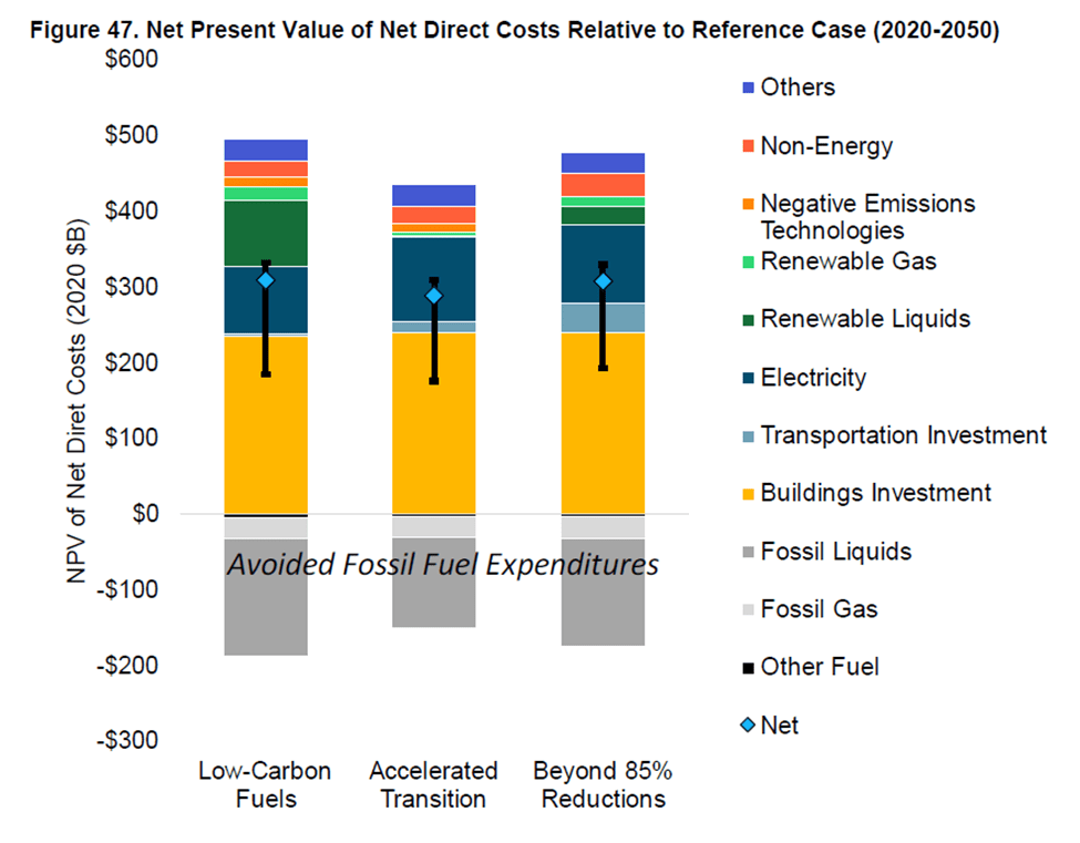 The total system expenditures are shown in Figure 48. The text notes that the reference case total is $2.7 trillion but that is the only quantified reference. I estimate that the mitigation scenarios are around $3 trillion making the costs relative to the reference case around $300 billion for the three mitigation scenarios. Also note that the values of the expenditure categories on the right are not listed so readers can only guess the values based on the size of the bars.