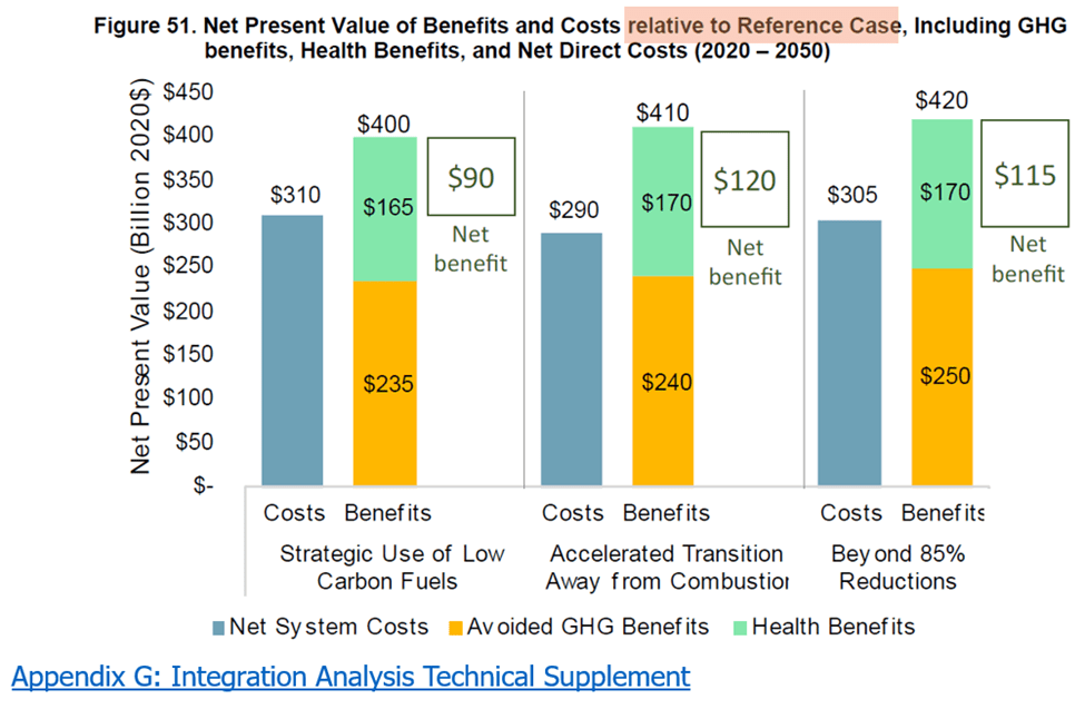 This graph has been shown at public comment hearings and is the support for the Draft Scoping Plan claim that “The cost of inaction exceeds the cost of action by more than $90 billion”. I explained that there were issues with cost numbers in addition to the benefits problems described previously. In particular, it is necessary to parse the language to understand how the Integration Analysis presents the costs. They are presented as net direct costs because the cost to use fossil fuels are subtracted from the costs to meet the reduction targets. The bigger issue is that the net present value of benefits and costs are presented relative to Reference Case. I admit that I did not pick up on the implications of that condition for five months. It turns out that vehicle electrification costs appear to be included in the Reference Case because the electric vehicle legislative mandate was an “implemented policy”. However, the $700 billion costs to electrify the transportation investment category are a necessary cost for the net-zero transition. I don’t think they should be included in the Reference Case because those costs are a necessary transition expense. If those costs are moved from the Reference Case to the mitigation scenarios where they belong, the costs are much greater than the benefits.