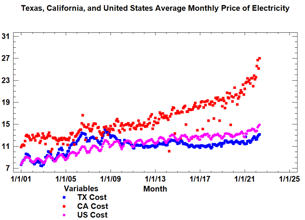 The RFF Retail Electricity Rates Under the Inflation Reduction Act of 2022 issues brief claims that the legislation, will “save typical American households up to $220 per year over the next decade and substantially reduce electricity price volatility.” My original conclusion was that the Texas cost and renewable generation data showed that it was unlikely that there would be cost savings due to increased renewable energy but I used incorrect data. Using the correct data, I could argue that the Texas results did not show a decrease which is contrary to the RFF projection, but it is also reasonable to argue that were it not for the renewable generation that costs would have increased more than they did. At first glance and without adjusting for inflation, California data suggested that increased penetration of renewable resources increases costs but there are clear uncertainties that make this a tenuous conclusion.