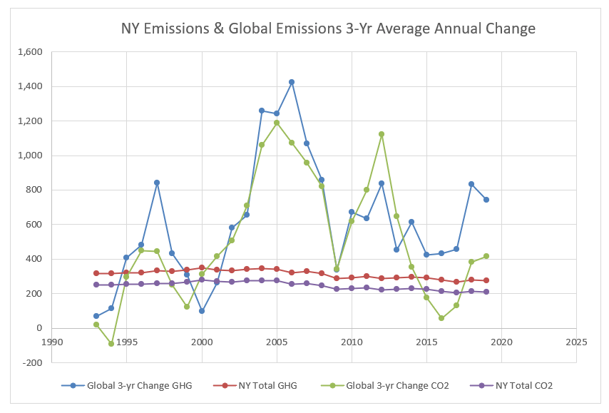 There are egregious mistakes in Rogers’ quote. As noted previously, the presumption that implementation of the Climate Act reductions will actually have any effect on the observed weather and associated impacts is wrong simply because any New York emission reductions are simply too small to affect global warming. In addition, New York GHG emissions have to be considered relative to global emissions. I found that New York emissions are less than one half of one percent of global emissions. On average, global emissions have been increasing by more than one half of one per cent per year for many years. Therefore, any effect New York could possibly have on global warming will be offset by global emission increases in a year.