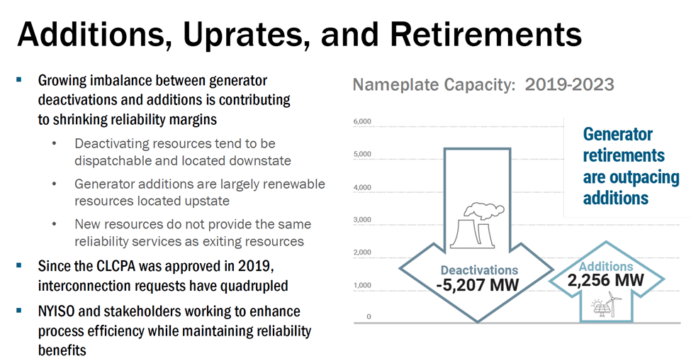 The New York Independent System Operator (NYISO) 2023-2042 System & Resource Outlook (“Resource Outlook”) described issues that threaten reliability and resilience of the current and future electric system. The report described current and future challenges for the electric system. The findings suggest that there will be significant reliability risks for the Climate Act transition.
