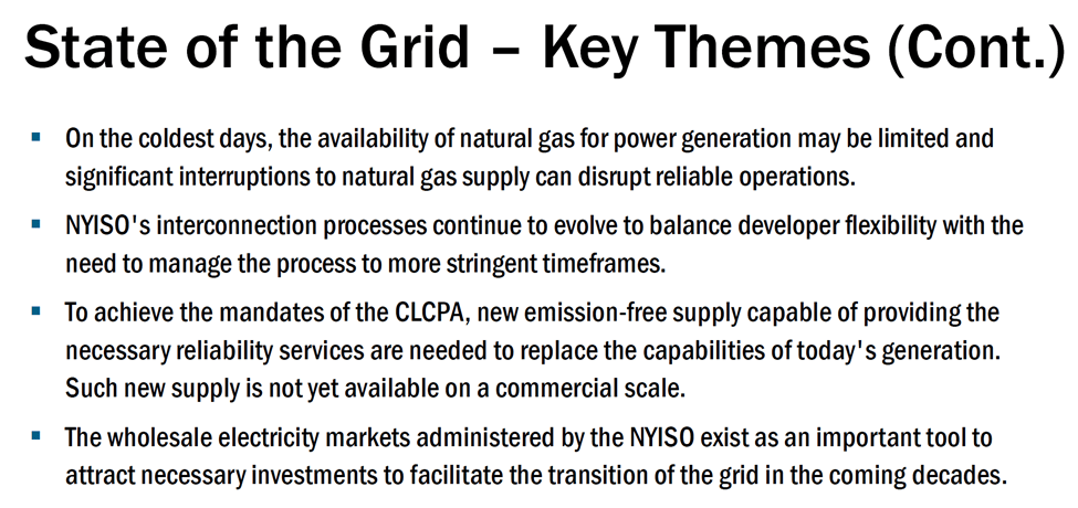 Even the New York Independent System Operator (NYISO) – the entity responsible for maintaining the reliability of the grid it oversees – has recently issued warnings as to the looming dangers ahead from insufficient and unreliable electricity supply. In its recent 10-year Power Trends study, NYISO sees the danger of unreliability of the grid as arising no later than the phasing out by December 31, 2030 of the New York Power Authority’s small natural gas plants located in New York City. The NYISO report states: