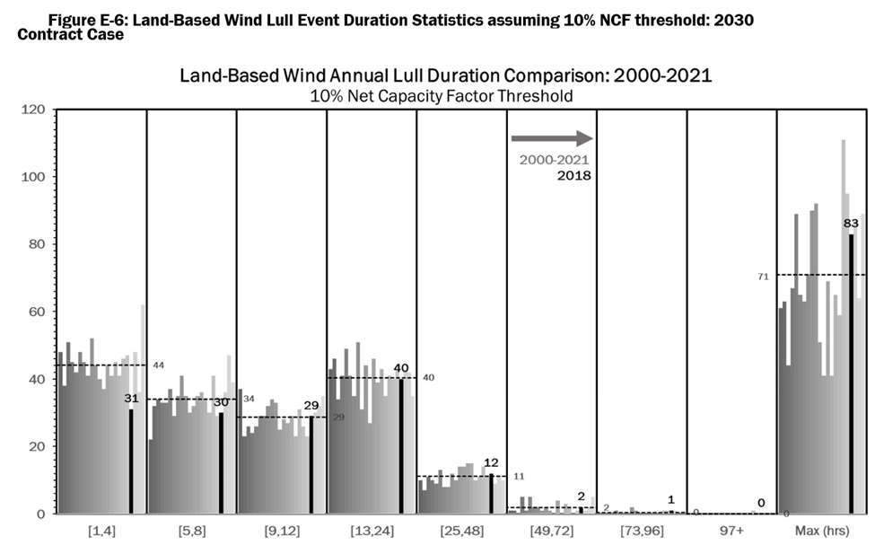 Figure E-6 presents the results of reviewing the LBW profiles over the 2000-2021 period on an annual basis assuming a 10% hourly NCF threshold (i.e., lull hours are defined as those with a NCF less than 0.1). The x-axis displays the event duration bins (e.g., “[1,4]” collect all one-to-four-hour events while “97+” collects all events that are 97 hours or longer) except for the last bin that displays the longest duration event in hours during the year. Each bar within a bin going from left to right represents the number of events in each duration bin for one year from 2000-2021, with 2018 labeled with black bars and the corresponding number of events. The dashed line across each bin shows the average value of the number of lulls (and maximum duration) across the 22-year period. The analysis shows that, in 2018, the longest event where LBW output stayed below 10% of capacity across New York was 83 hours long and there were 12 events between 25 and 48 hours long. The chart also shows that there were less short duration LBW lull events in 2018 relative to the 22-year average but that there were in general more lulls longer than one day in duration than in a typical year.