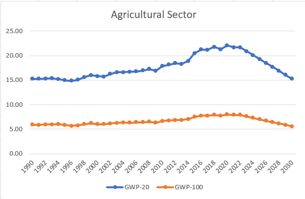 I include the agricultural sector for completeness but caution that I don’t know how the emissions will be handled. I know that some emissions are exempt but exactly how many I do not know. In any event the effect of the methane bias is obvious. It also is obvious that expecting the agricultural sector to make its share of emission reductions is unlikely.
