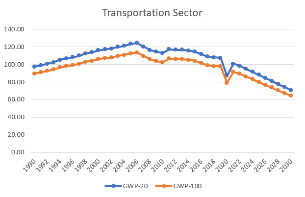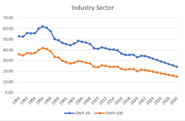 I am not familiar with the control strategies for other sectors but the same unsettling emission trajectory reduction rates are apparent. The biggest source of emissions using GWP-20 is buildings. Because GWP-20 accentuates the effect of natural gas, there will have to be a real concerted effort to switch existing building sector gas away from natural gas. In my opinion neither emission reduction trajectory rate looks realistic relative to historical emissions but the GWP-20 rate (31% between 2020 and 2030) is more unlikely.