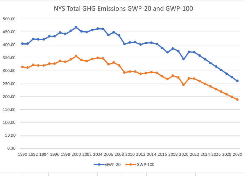 In order to look at the numbers I developed a spreadsheet that uses the NYS GHG emissions by Global Warming Potential for 20-year and 100-year time frames. The observed data from 1990 to 2020 are from the 2022 Statewide GHG Emissions Report and the associated data on Data NY for Statewide GHG Emissions.