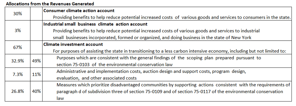 The accounts have mandated allocations and purposes. The Consumer Climate Action Account is allocated 30% of the revenues collected and the money “shall be expended for the purposes of providing benefits to help reduce potential increased costs of various goods and services to consumers in the state.” The Industrial Small Business Climate Action Account is allocated no more than 3% for “the purposes of providing benefits to help reduce potential increased costs of various goods and services to industrial small businesses incorporated, formed or organized, and doing business in the state of New York.” The Climate Investment Account is allocated the remaining 67% for the purposes of assisting the state in transitioning to a less carbon intensive economy.