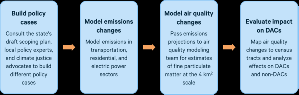 Several characteristics of our research set it apart from other research efforts. Our contribution to examining the outcomes of decarbonization policies on EJ communities at a state level is unique. Additionally, we use a combination of behavioral models and one of the most sophisticated air quality models to assess and trace the consequences of the two policy cases for disadvantaged communities (DACs) and non-DACs. Further, mapping these results visually at the 4km2 scale gives readers an unprecedented ability to assess and understand the geographic distribution of results.