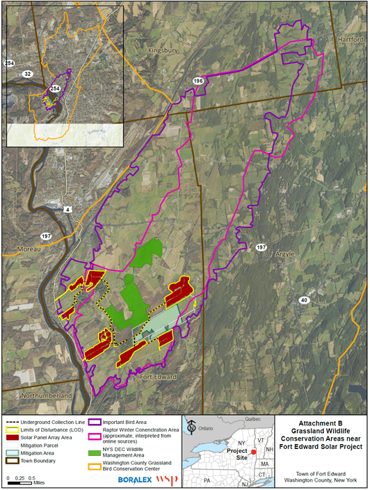 “The proposed Project Site surrounds the WMA and is situated within a recognized ecological area of critical importance for grassland birds . . .” Specifically, the WMA anchors the adjacent Audubon-designated Fort Edward Grasslands Important Bird Area (IBA), the NYNHP Raptor Winter Concentration Area, Grassland Bird Trust (GBT) properties, NYSDEC Grassland Wildlife Management Area, all areas known to be occupied by threatened and endangered bird species.