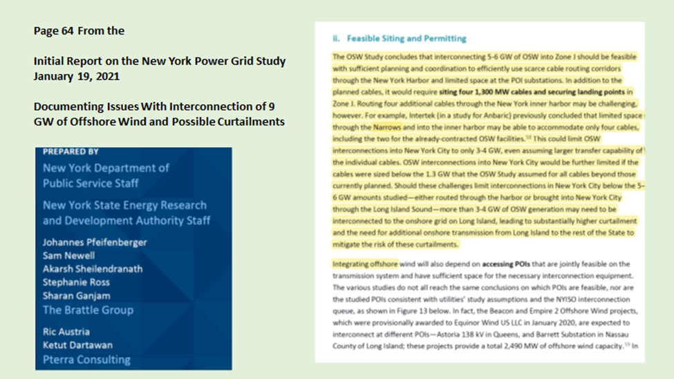 This is also apparent with regard to the 9 GW of offshore wind. There is a major concern about the availability of space to run the cables to interconnect the energy to where it is needed. One possibility is running the cables across Long Island in an environment where every infrastructure project is faced with lawsuits. As a result, even if they can build the 9 GW of Atlantic Wind, they may only be able to interconnect about 6 GW to where it is needed. That is clearly shown in another slide from the upcoming PowerPoint documenting a critical page in a NY State Power Grid report, below. Transferring renewable generation installation projects to NYPA may increase the rate of installation slightly but the node analyses will still have to be done that takes five years at present and the transmission lines will still have to be installed so the price will not be reduced.