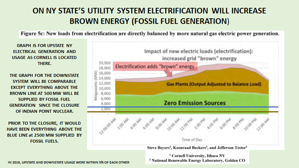 As the chart shown below from a Cornell Geothermal report clearly show, all additional load added to the system is supported by fossil fuel generation. Blue and Brown lines were added after to explain the difference between the upstate and downstate generation sources which in 2019 were within 5% of each other. However, in terms of zero emissions sources, they were worlds apart. The downstate system is almost entirely supplied by fossil fuels.
